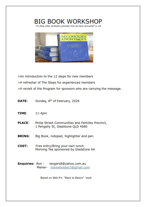 Big Book Workshop – Gladstone When Sun, 8 Feb 11:00 am - 4:00 pm Add To Calendar Download ICS Google Calendar iCalendar Office 365 Outlook Live Event Type Upcoming Events Gladstone AA Fellowship is hosting a Big Book workshop. *Sunday 8 February @ 11 am – 4 pm 1 Pengilly St, Gladstone (Communities and Families Precinct) *Free entry *Morning Tea provided *Bring your own lunch