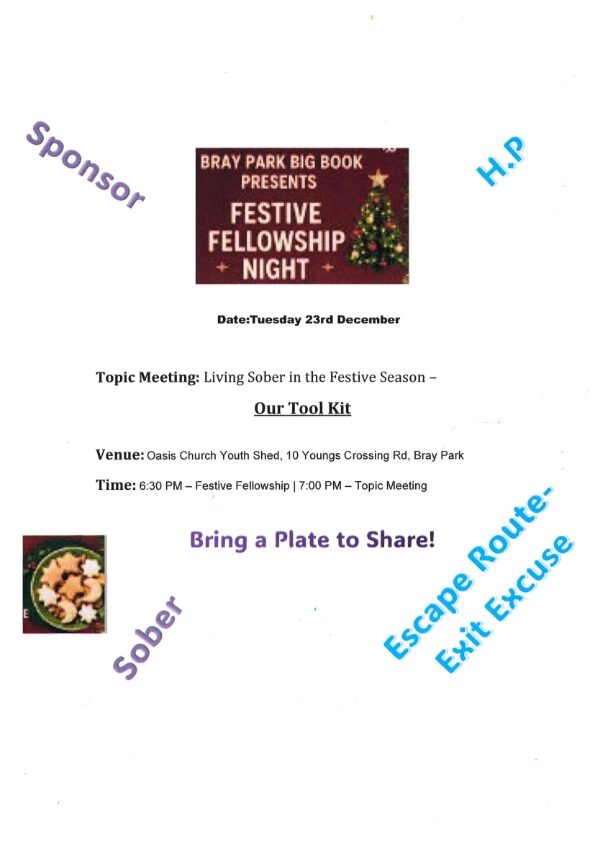 Bray Park Festive Fellowship Night When Tue, 23 Dec 6:30 pm - 8:30 pm Add To Calendar Download ICS Google Calendar iCalendar Office 365 Outlook Live Event Type Events Bray Park Big Book Presents: FESTIVE FELLOWSHIP NIGHT Oasis Church Youth Shed, 10 Young’s Crossing Rd, BRAY PARK Festive Fellowship @ 6:30 pm Topic Meeting @ 7 pm