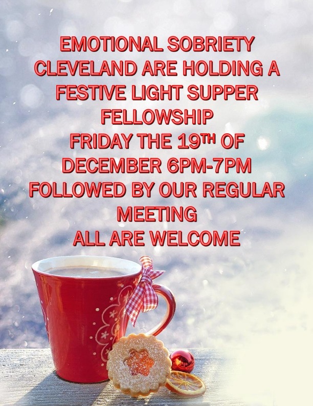 Cleveland Festive Supper When Fri, 19 Dec 6:00 pm - 8:00 pm Add To Calendar Download ICS Google Calendar iCalendar Office 365 Outlook Live Event Type Group Celebrations Cleveland Into Action Emotional Sobriety group is holding a festive light supper and fellowship. Catholic Church Hall, 51 Passage St. Friday 19th December @ 6pm Followed by meeting @ 7pm