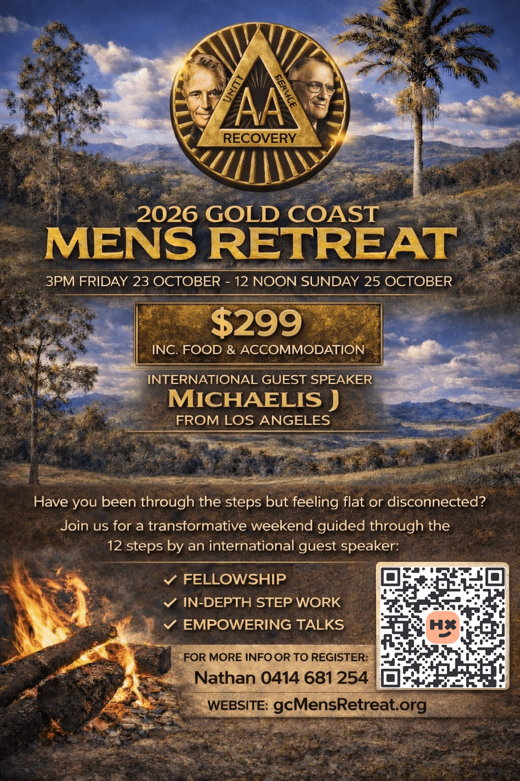 Gold Coast Men’s Retreat October 2026 When Fri, 23 Oct - Sun, 25 Oct Add To Calendar Download ICS Google Calendar iCalendar Office 365 Outlook Live Event Type Events 2026 Gold Coast Men’s Retreat 23 Oct – 25 Oct