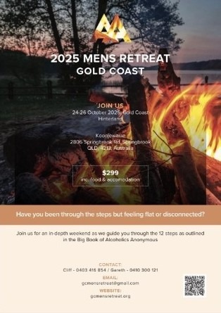 Gold Coast Men’s Retreat When Fri, 24 Oct - Sun, 26 Oct Add To Calendar Download ICS Google Calendar iCalendar Office 365 Outlook Live Event Type Events 24 to 26 th October Koonjewarre 2806 Springbrook Rd, Springwood.