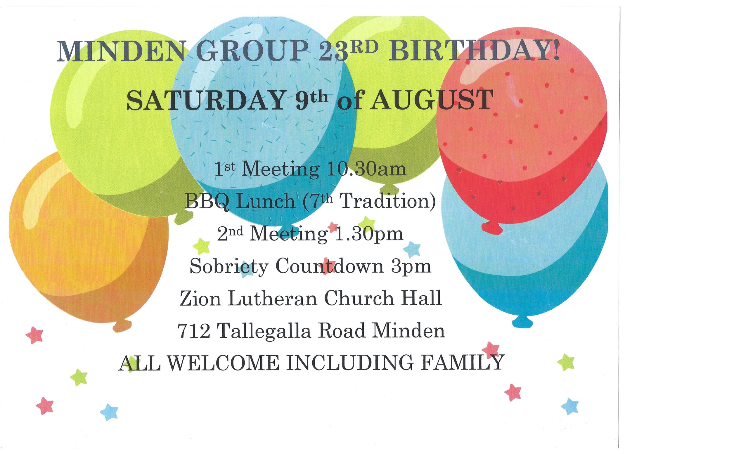 Minden Group 23rd Birthday When Sat, 9 Aug 10:30 am - 4:00 pm Add To Calendar Download ICS Google Calendar iCalendar Office 365 Outlook Live Event Type Group Celebrations Saturday 9th August 10.30am to 4pm 712 Tallegalla Rd Minden