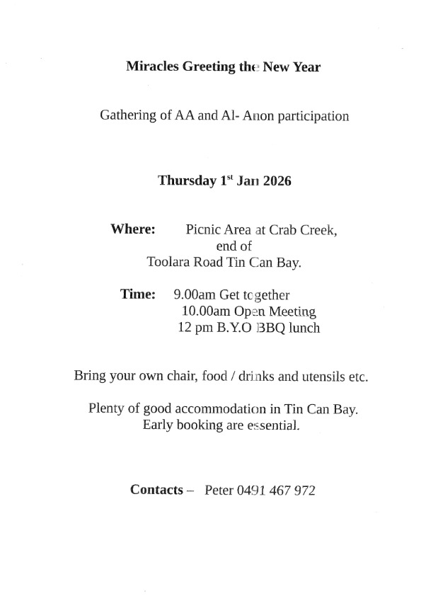 New year’s Day Tin Can Bay When Thu, 1 Jan 9:00 am - 2:30 pm Add To Calendar Download ICS Google Calendar iCalendar Office 365 Outlook Live Event Type Events Crab Tree Picnic Area, Toolara Rd, TIN CAN BAY Get together @ 9am Meeting @ 10 am Lunch @ 12 pm