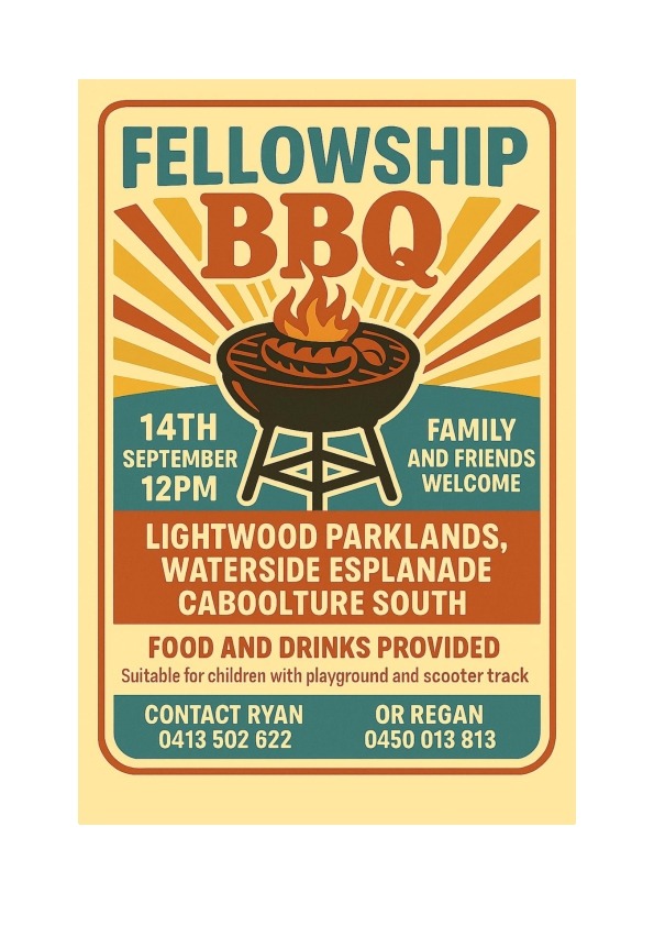 CABOOLTURE Fellowship BBQ When Sun, 14 Sep 12:00 pm - 2:00 pm Add To Calendar Download ICS Google Calendar iCalendar Office 365 Outlook Live Event Type Events 14th September @ 12pm