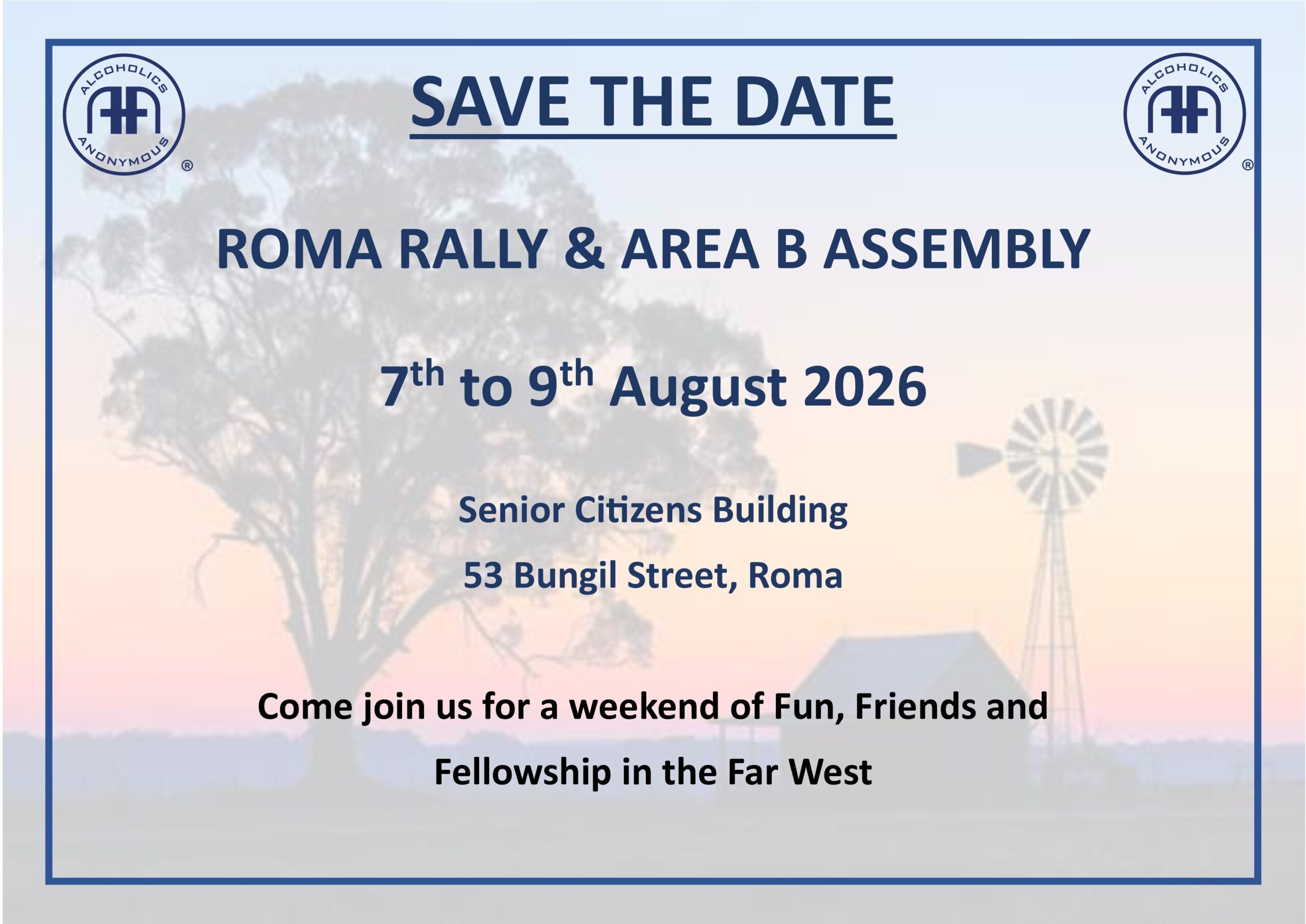 Roma Rally and Area B Assembly When Fri, 7 Aug - Sun, 9 Aug Add To Calendar Download ICS Google Calendar iCalendar Office 365 Outlook Live Event Type Events Save the Date 7th to 9th August Roma Rally and Area B Assembly Senior Citizens Building 53 Bungil Street, Roma. Come join us for a weekend of Fun, Friends and Fellowship in the Far West.