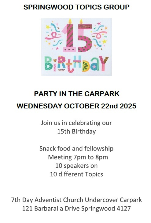 SPRINGWOOD TOPICS 15th Birthday When Wed, 22 Oct 7:00 pm - 8:00 pm Add To Calendar Download ICS Google Calendar iCalendar Office 365 Outlook Live Event Type Group Celebrations Springwood Topics is celebrating their 15th Birthday. Wednesday October 22nd @ 7pm 7th Day Adventist Church, 121 Barberella Drive, Springwood.