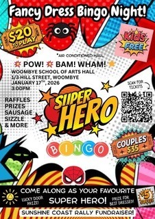 Sunshine Coast Fundraiser When Sat, 17 Jan 3:00 pm - 6:30 pm Add To Calendar Download ICS Google Calendar iCalendar Office 365 Outlook Live Event Type Events The Sunshine Coast is hosting a Fundraiser FANCY DRESS BINGO NIGHT 17th January 2026 @ 3 PM 1/3 Hill St, Woombye.