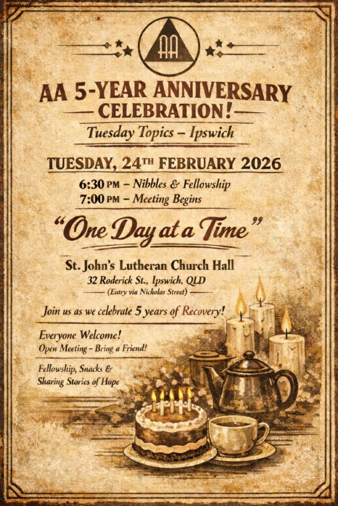 Tuesday Topics Ipswich 5th Birthday Celebration When Tue, 24 Feb 6:30 pm - 8:30 pm Add To Calendar Download ICS Google Calendar iCalendar Office 365 Outlook Live Event Type Events Ipswich Tuesday Topics is celebrating 5 years. 24th February @ 6:30 pm St John’s Lutheran Church 32 Roderick St, Ipswich.